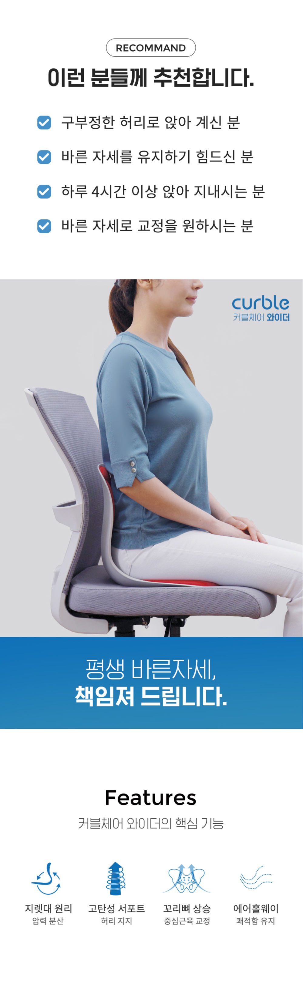 커블 체어는 스마트폰, 좌식생활, 과도한 업무, 장거리, 장시간 운전 시 무너지기 쉬운 근육들을